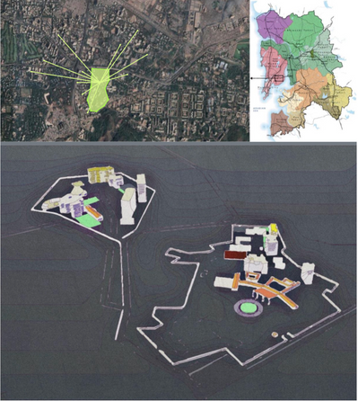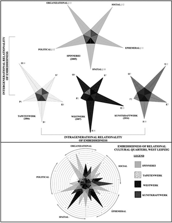 3-dimensional visualization of "Comparative cultural quarter embeddedness: top view and isometric view AutoCAD technical drawings created by Arun-Pina, C for Authors: Bain, A.L. and Landau, F. 2021. Generationing cultural quarters: the temporal embeddedness of relational places, Urban Geography, DOI: 10.1080/02723638.2021.1940446